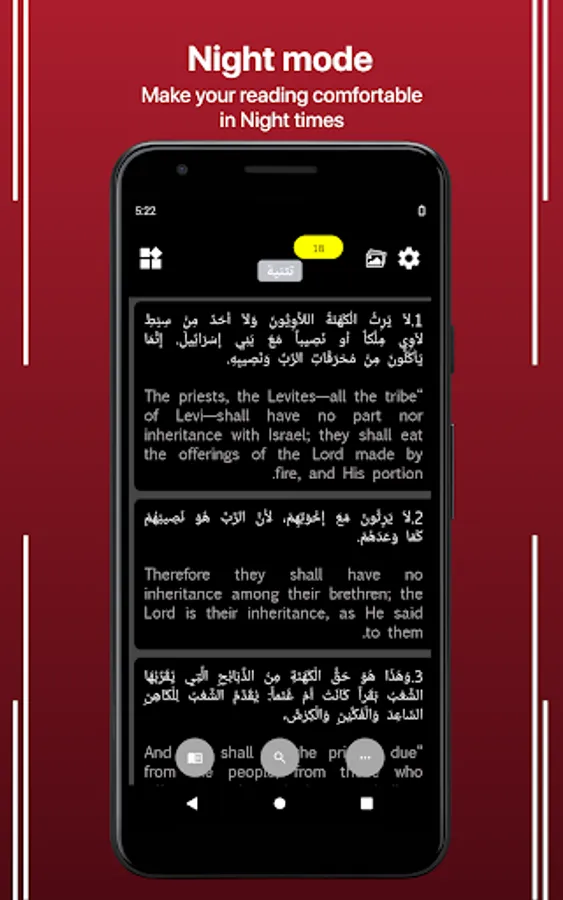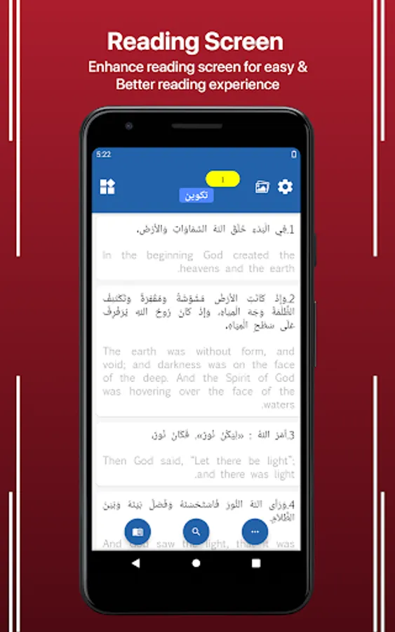 The Bi-lingual version of Arabic– English Bible is established in a single application. The righteous meaning of a Verse in the Holy Bible Scripture is now readable in two languages simultaneously. There are other languages in the bi-lingual app, with inclusion from the Oly Bible brand turning the novel readers into Bible readers in easily understanding the wordings of God Jesus. Read the Holy Bible in your mother tongue accompanied by English; here, it's Arabic and English parallel Bible.