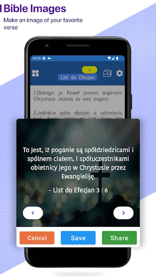 Quotes: Define the verses in different sections placed over an image that the user can use severally.