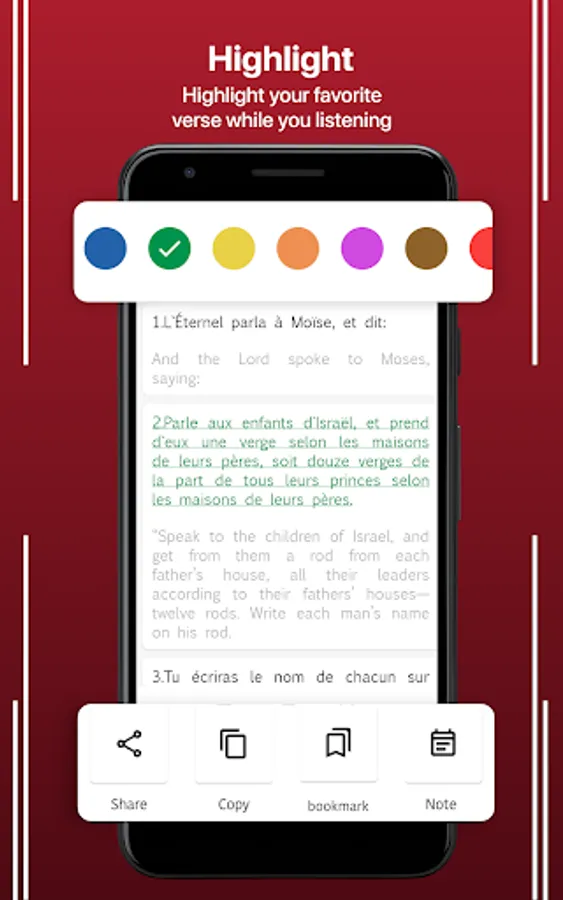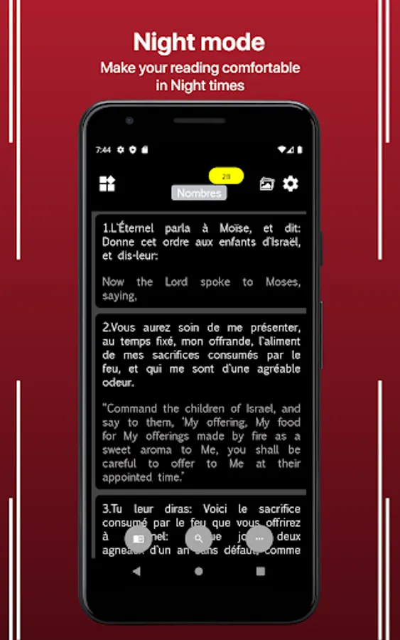 The Bi-lingual version of French–English Bible is established in a single application. The righteous meaning of a Verse in the Holy Bible Scripture is now readable in two languages simultaneously. There are other languages in the bi-lingual app, with inclusion from the Oly Bible brand turning the novel readers into Bible readers in easily understanding the wordings of God Jesus. Read the Holy Bible in your mother tongue accompanied by English; here, it's French and English parallel Bible.