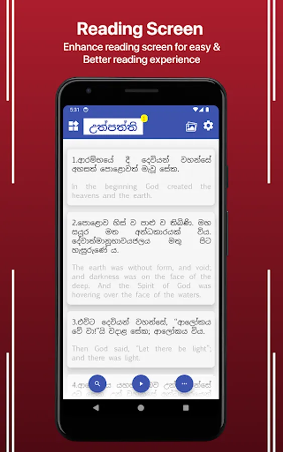 The Bi-lingual version of Nepali-English Bible is established in a single application. The righteous meaning of a Verse in the Holy Bible Scripture is now readable in two languages simultaneously. There are other languages in the bi-lingual app, with inclusion from the Oly Bible brand turning the novel readers into Bible readers in easily understanding the wordings of God Jesus. Read the Holy Bible in your mother tongue accompanied by English; here, it's Nepali and English parallel Bible.
