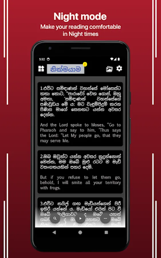 Dark Mode: Make the bible reading in the dark mode with text inversed in white color and background color in black.