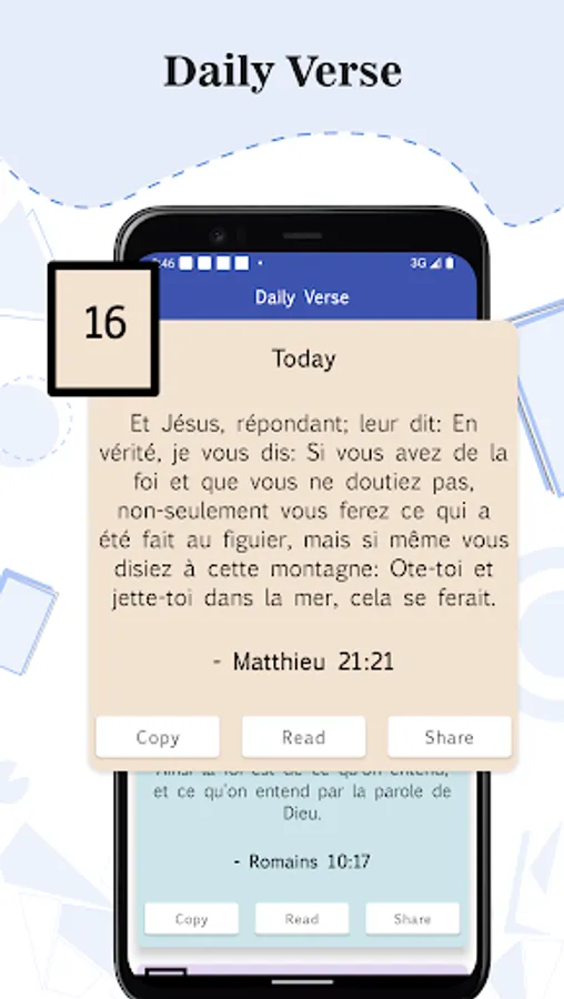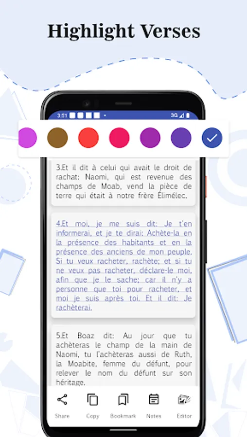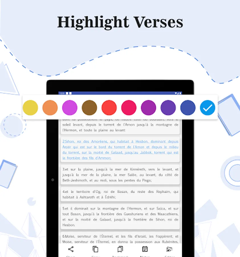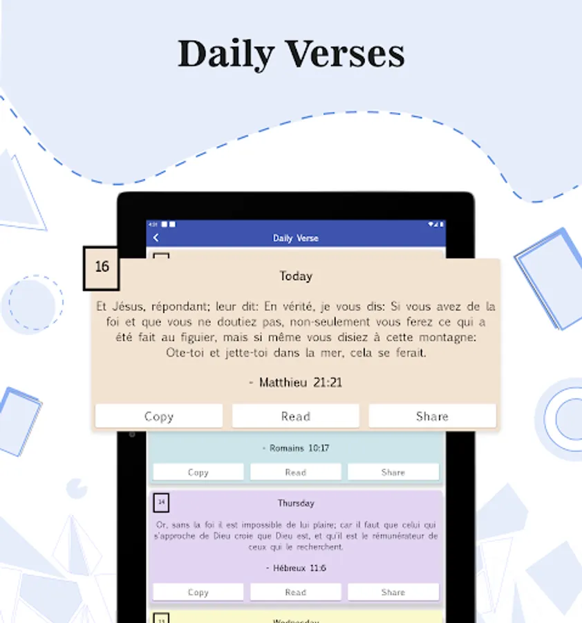 Daily Verse: Start each of your days with the random verse that appears on the Holy Bible app, where it can be copied and shared.