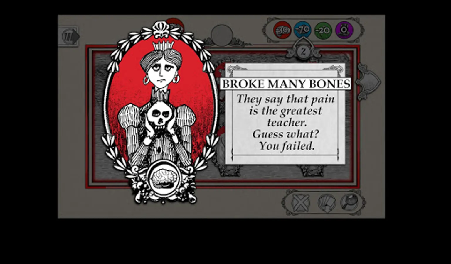 In Gloom: Digital Edition, you play a series of morbidly humorous negative Modifier Cards on your family members giving them negative Self-Worth points. Such tragedies as "Being mauled by manatees", "Swindled by salesmen" and "Menaced by mice" are "good" for you. And, you play positive Modifier Cards on your rival's family giving them positive Self-Worth points. Good fortune such as being "Delighted by ducklings", "Found fame at a feast", and Blessed by the bishop are "bad" for them.