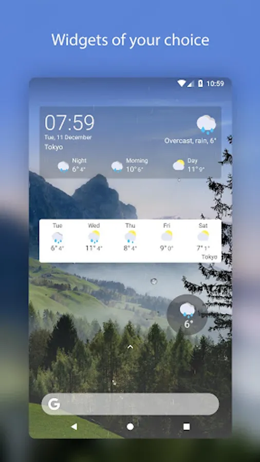In a realistic weather application there are several types of widgets: a round widget for 1 cell showing the temperature and probability of precipitation, a widget with weather for 3 days and hours, as well as a widget with weather for 5 days. Any widget can be made transparent or choose a background color in the settings when added to the desktop.