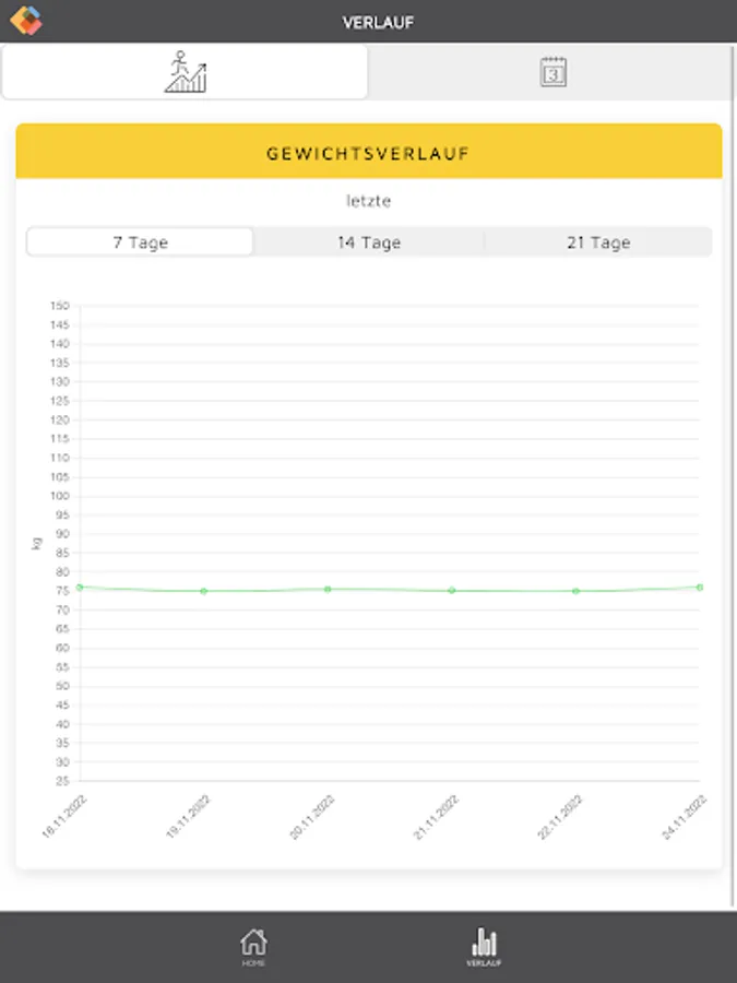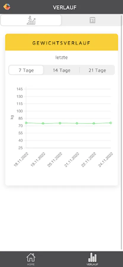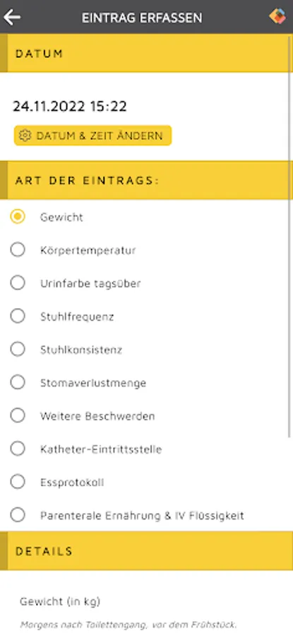 The eSwissHPN app is a documentation aid for people with parenteral nutrition at home, with which they can keep a log of progress parameters (such as weight, body temperature, nutrition log). All past entries can be viewed in the course and the weight history is also shown graphically. The app can also be used to talk to specialists via video call.
