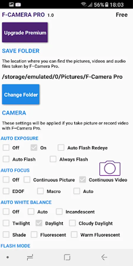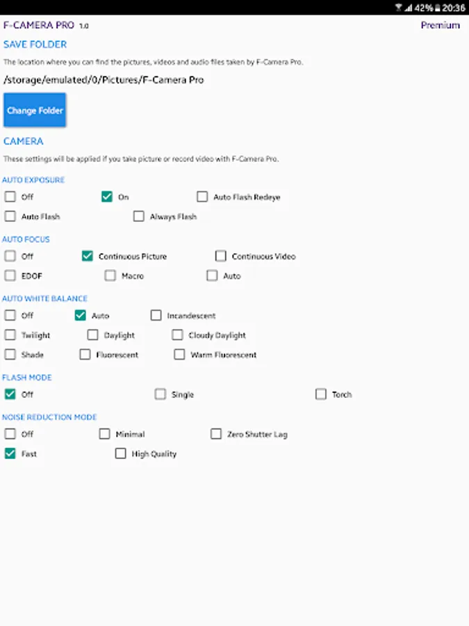 ✓ Default saved files at the directory "/Pictures/F-Camera Pro/".