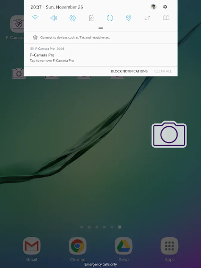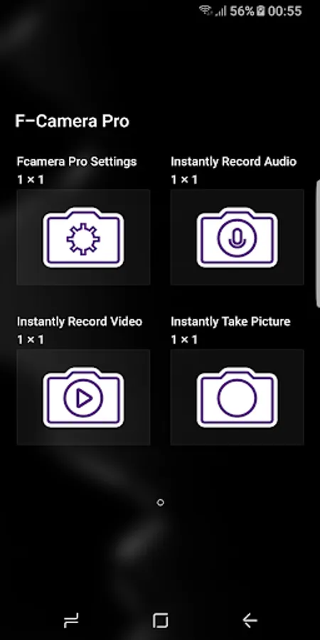 The powerful features of F-Camera Pro are built-in widgets. They allow you take picture, record video or record audio instantly! Find them in the widget screen.