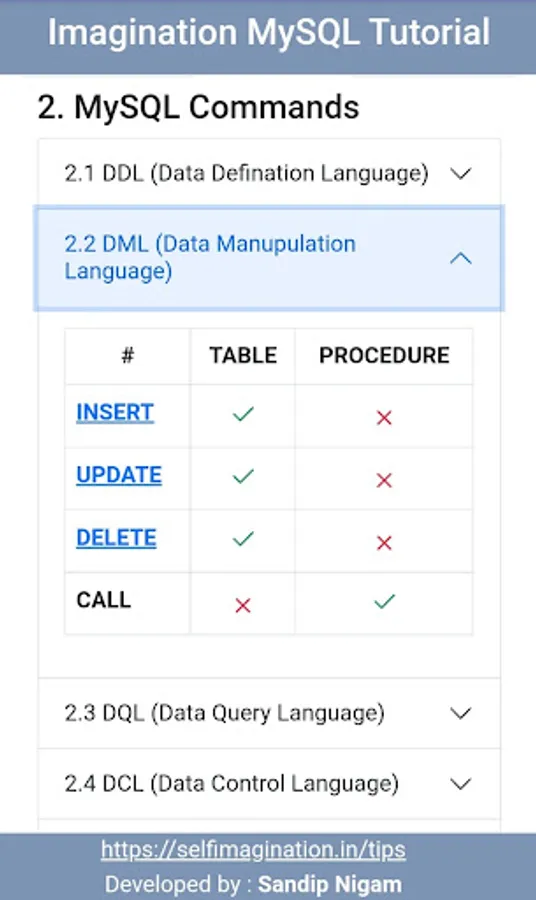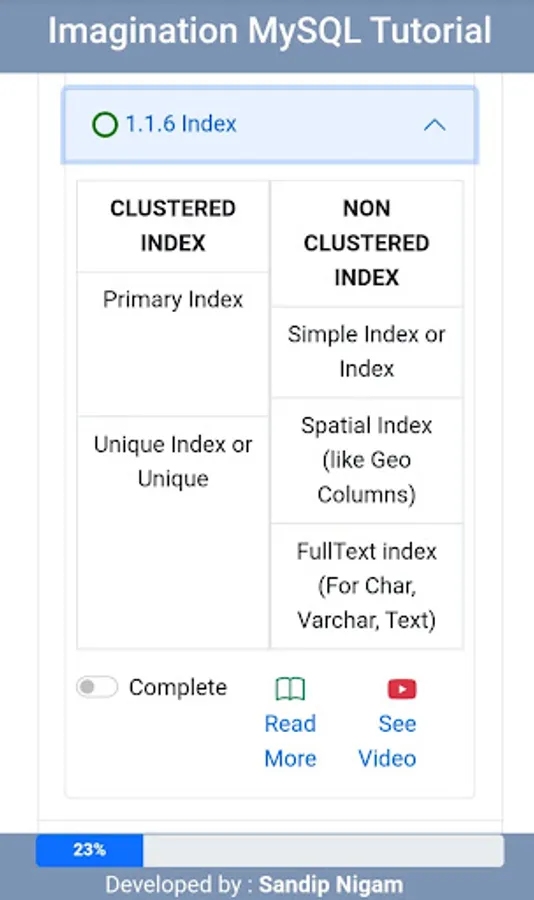 In this app you have been told about MySQL from basic and also you can read it chapter wise, written in very simple language and explained with example, where diagram is needed and where. if you read its article, then you can understand MySQL in just 30 days.