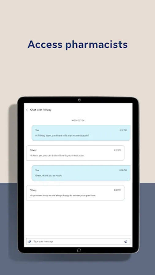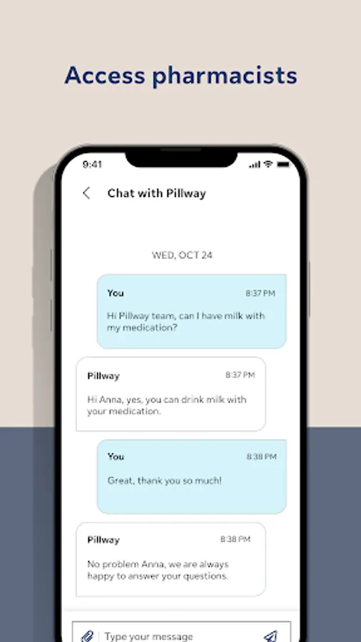 • Skip the wait. Get 1:1 support when it suits you. Chat with Pillway’s trusted and knowledgeable pharmacy support team about all your medication questions.