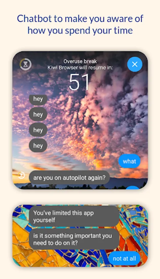 At other breaks a chatbot will make you aware of your phone habits or give you health and wellness tips