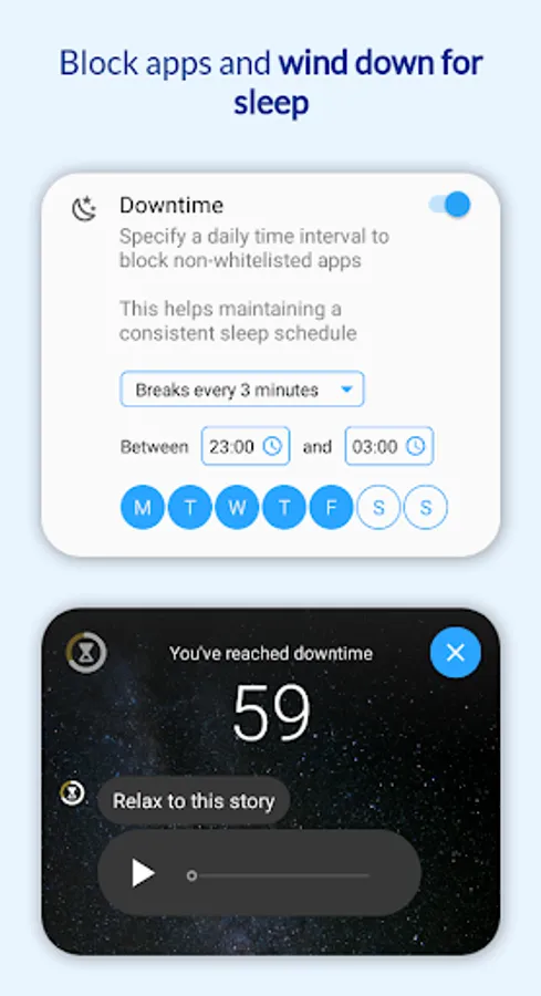 Maintain a sleeping schedule by blocking apps during bedtime and switching to your attention to something relaxing.