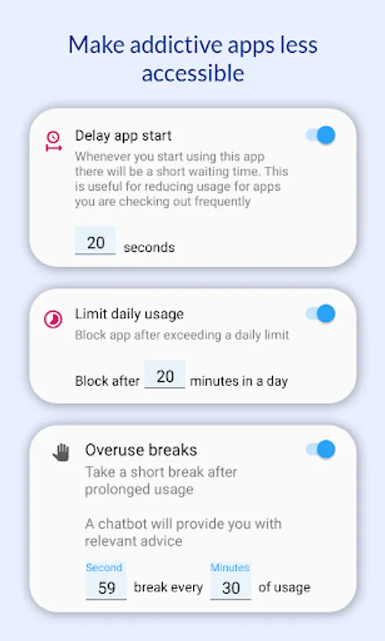 This allows you to set daily usage limits for apps. After a limit is reached the app will be blocked and the limit cannot be changed. Blocked apps and their limits are unlocked the next day