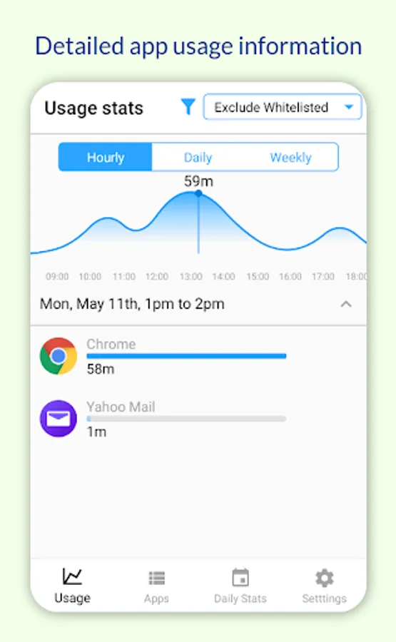 Some important apps are whitelisted and will not be affected by the overuse break. You only need to install the app to start your digital detox. The default settings are a good start to take control of your wasted time