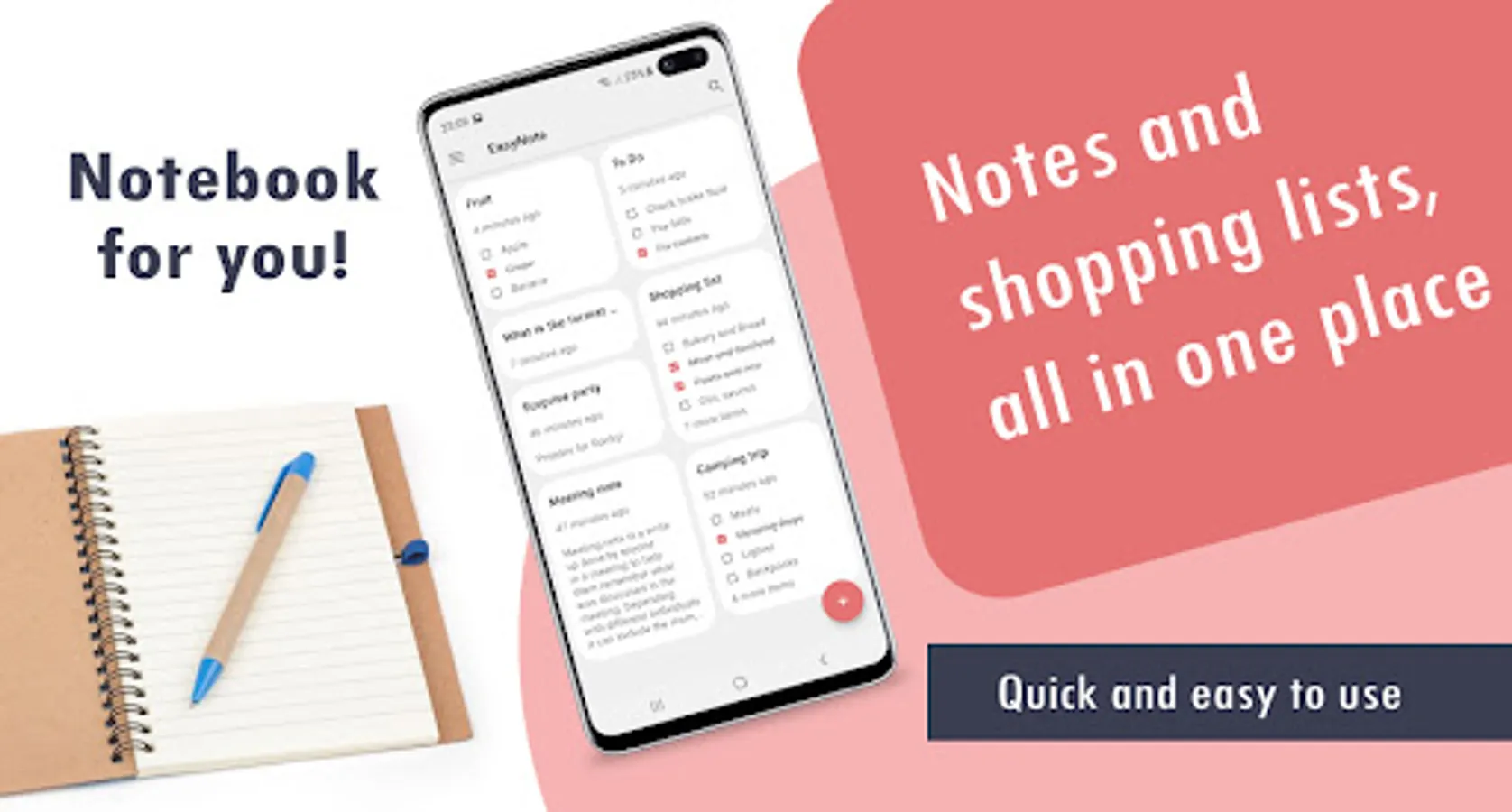 EasyNote is a simple notebook for all your needs, aimed at making it easier to manage your notes. Making a note with Notepad has never been easier. Choose when adding whether you want to create a checklist or just a note. Do you have a very important note that you review often? No problem. Select the "pin" option and the note will always be at the top of the list.