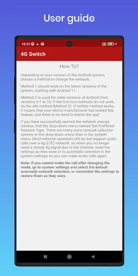 It should be noted that most network operators still do not support voice calls over a 4g network, so you will probably not be able to receive voice calls while using this network mode. When you force 4g only, the device cannot switch to 2g or 3g mode to receive the call. When you have finished using the application, restore the settings as they were to allow the device to function normally. If you forget the settings, go to system settings and select automatic network selection.