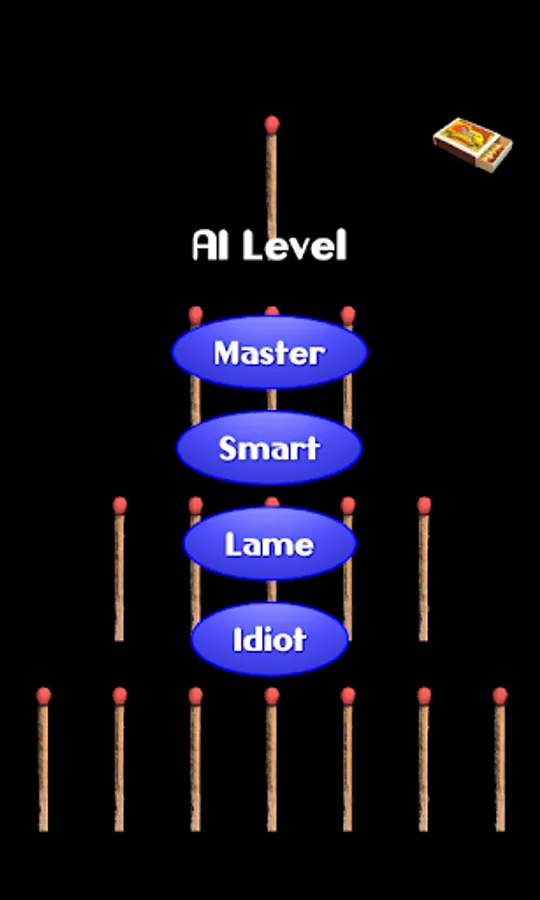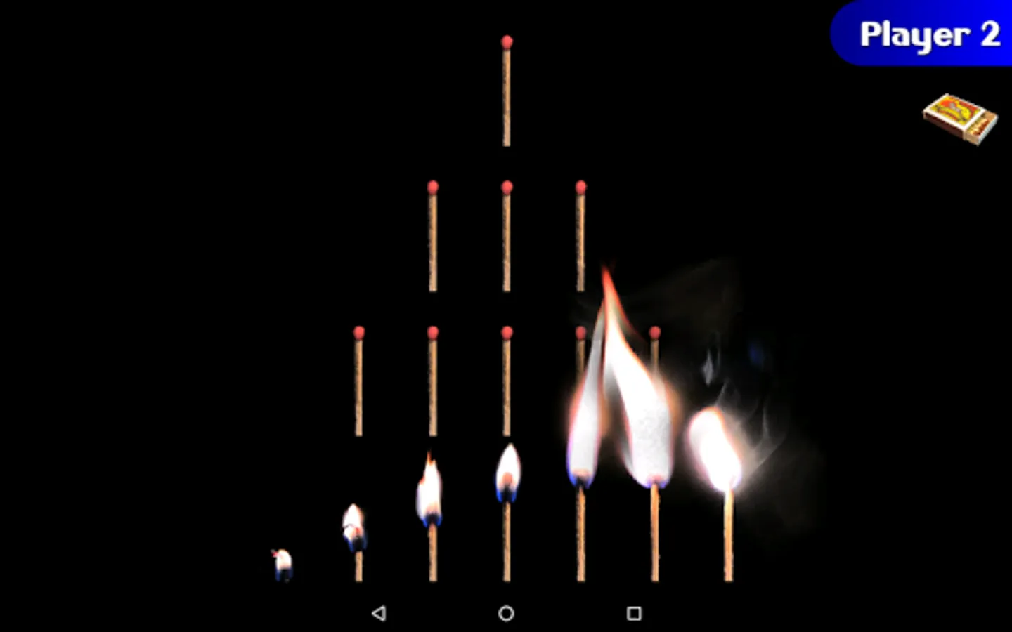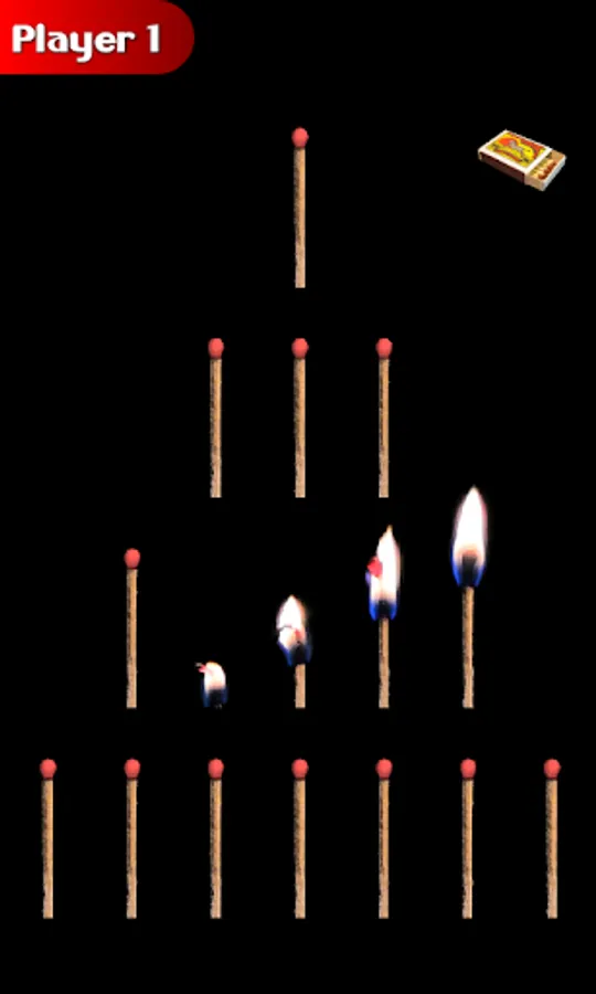 15 matches are laid out in 4 rows. Touch a match, and it will burn. All the other matches on the right of it will burn, too. You have made your move, and now your opponent must do the same. The players take turns until all the matches are gone. The player which burns the last match loses.
