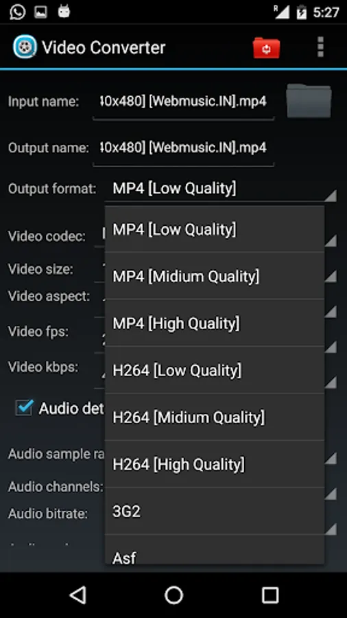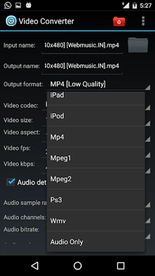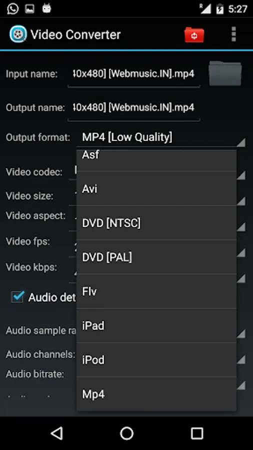 Video Converter to convert video file to other formats like WMV, MP4, H264, 3G2, ASF, AVI, DVD [NTSC], DVD [PAL], FLV, iPAD, iPOD, MPEG1, MPEG2, PS3, VOB and audio only.