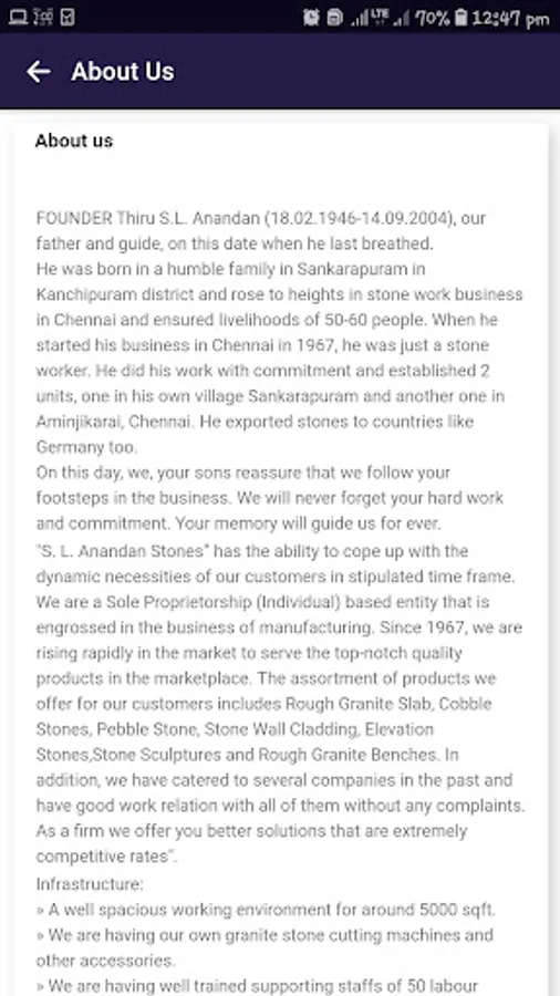 S. L. Anandan Stones has the ability to cope up with the dynamic necessities of our customers in stipulated time frame. We are a Sole Proprietorship (Individual) based entity that is engrossed in the business of manufacturing. Since 1967, we are rising rapidly in the market to serve the top-notch quality products in the marketplace. The assortment of products we offer for our customers includes Rough Granite Slab, Cobble Stones, Pebble Stone, Stone Wall Cladding, Elevation Stones,Stone Sculptures and Rough Granite Benches. In addition, we have catered to several companies in the past and have good work relation with all of them without any complaints. As a firm we offer you better solutions that are extremely competitive rates.
