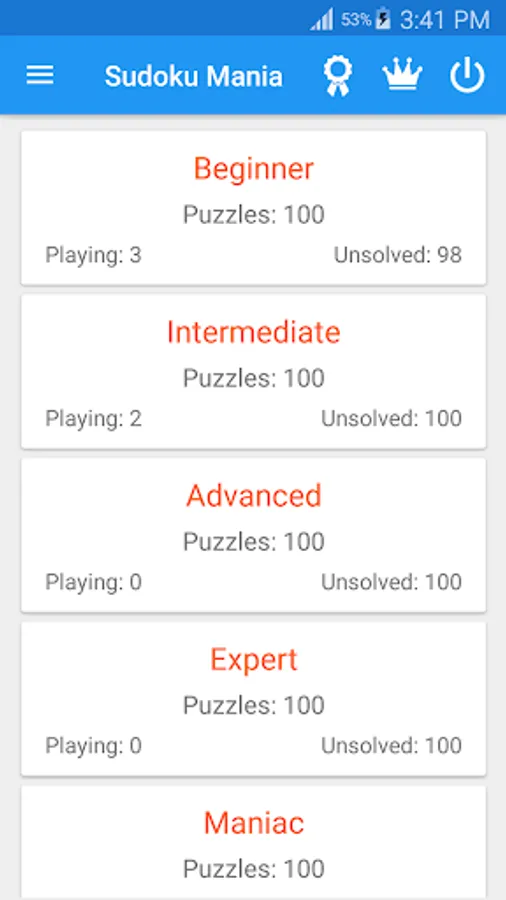 * 5 Difficulty Levels - Beginner, Intermediate, Advanced, Expert and Maniac, with 100 puzzles in each level.