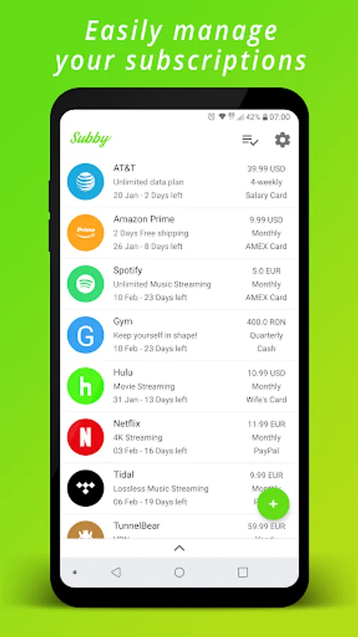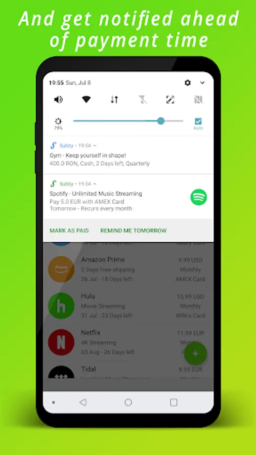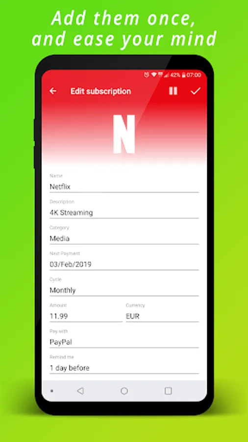 Easily manage your subscriptions and get notified ahead of payment time. Don't ever forget to pay your subscriptions in time again.