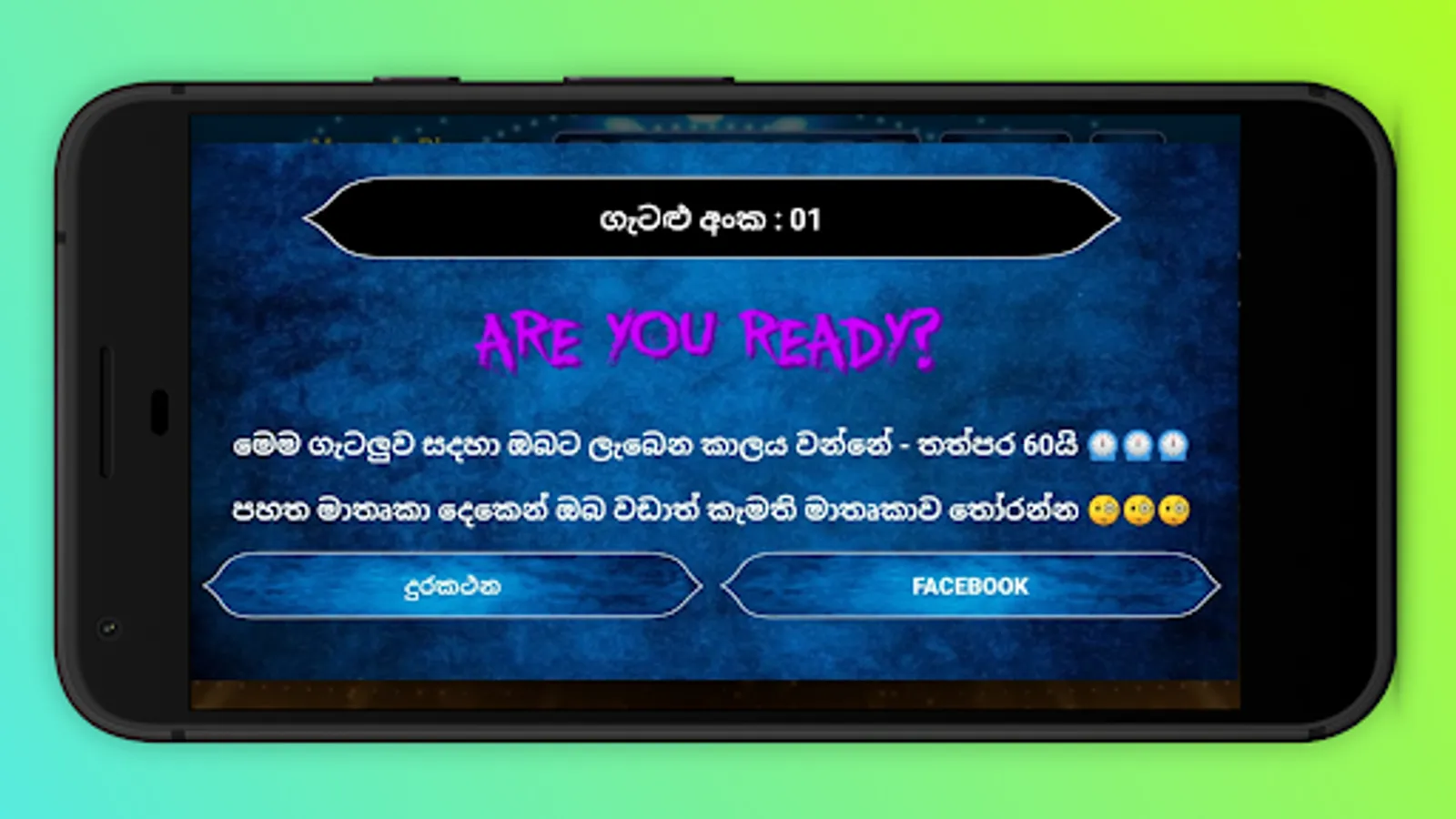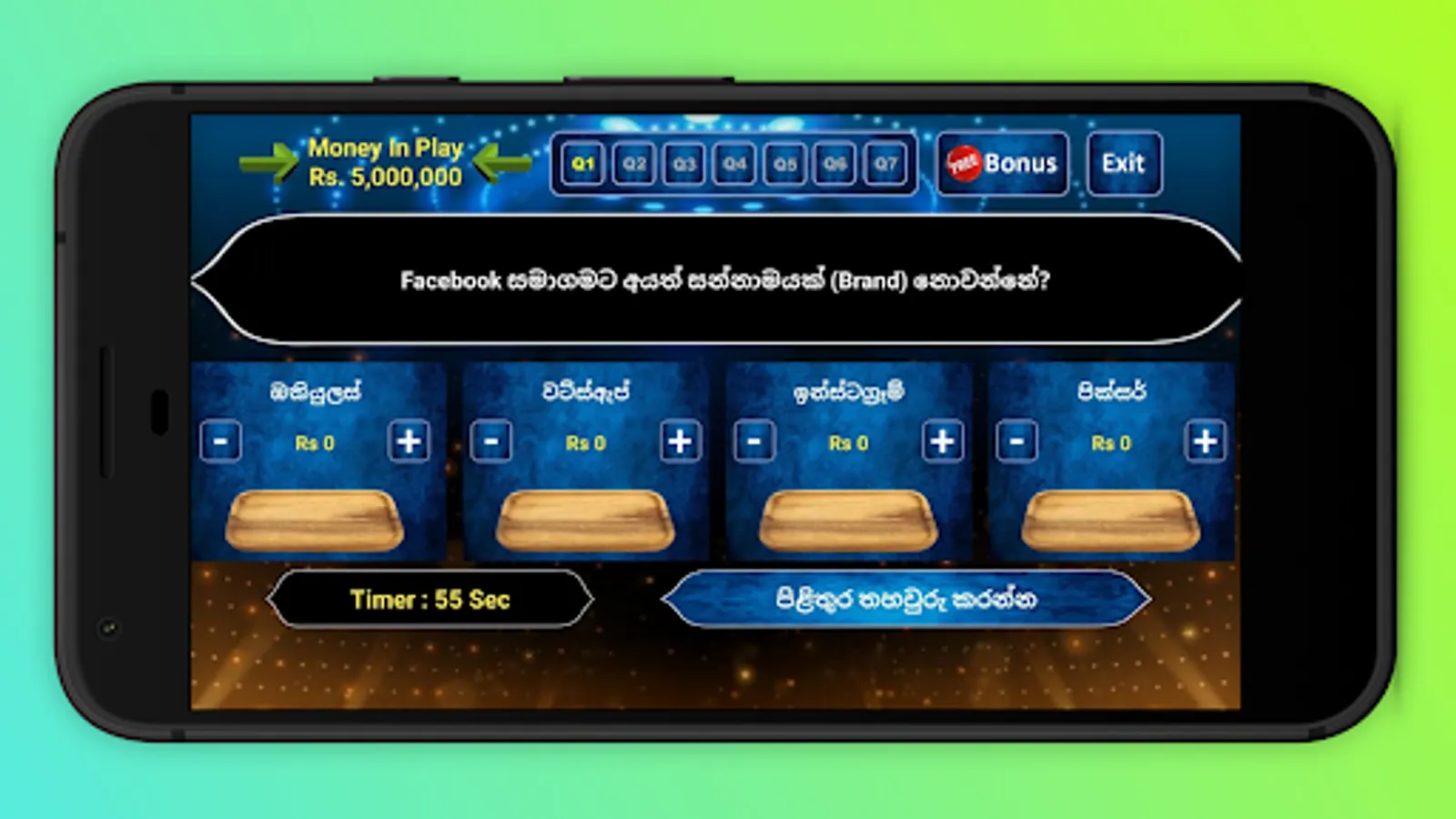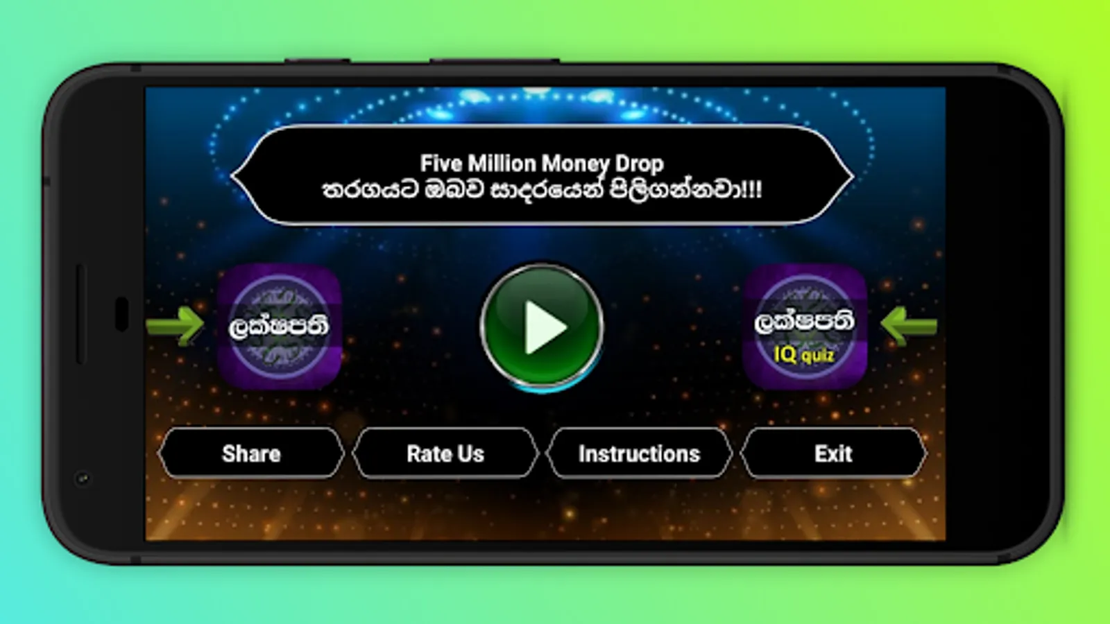 In this app (Five Million Money Drop Game), we have included a set of IQ questions & general knowledge question (Samanya Danima Gatalu) and given you a chance to test your knowledge and memory. We have mainly focused on the questions related to Science, Traditions, Cultures, Art, Music, etc. All the steps of this game are designed very similarly to the 5 Million Money Drop Sinhala Programme and "Million Dollar Money Drop" international program. So by using this app you will be able to gain international experience and good IQ knowledge.