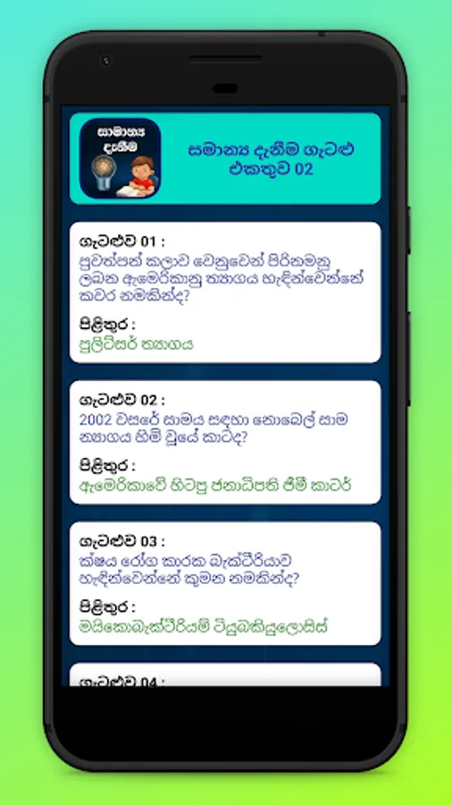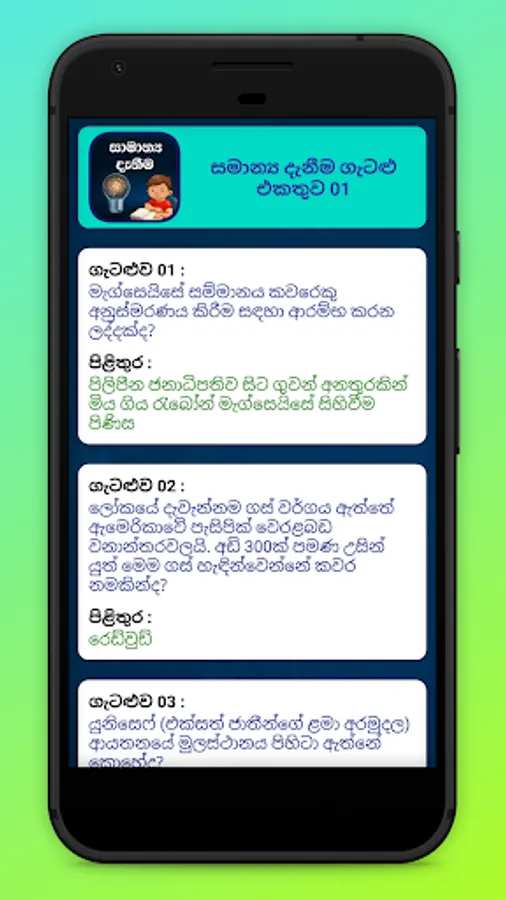 If you are a General Knowledge seeker (Samanya Danima) in Sri Lanka, this app will be an ideal app for you. Here we have included so many IQ questions related to politics, environment, sports, technology, education, science, history, etc.