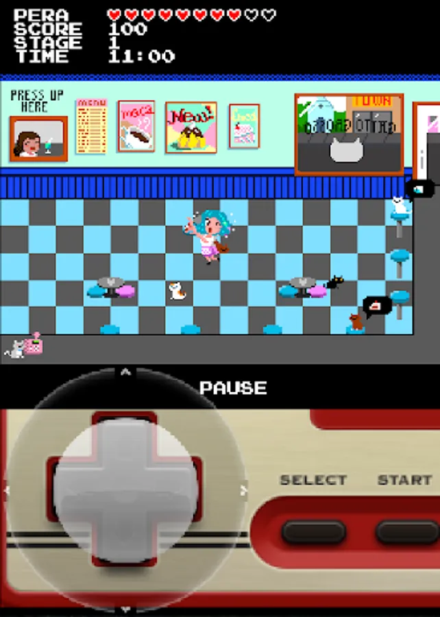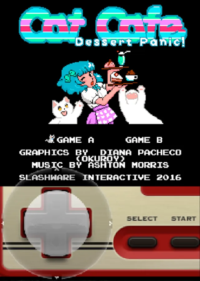 CatCafe is an arcade game where you have to fed the cats in the bar while avoiding other cats who jump at you. If you take too long to deliver the food, or if a cat makes you drop it, you will lose one heart.