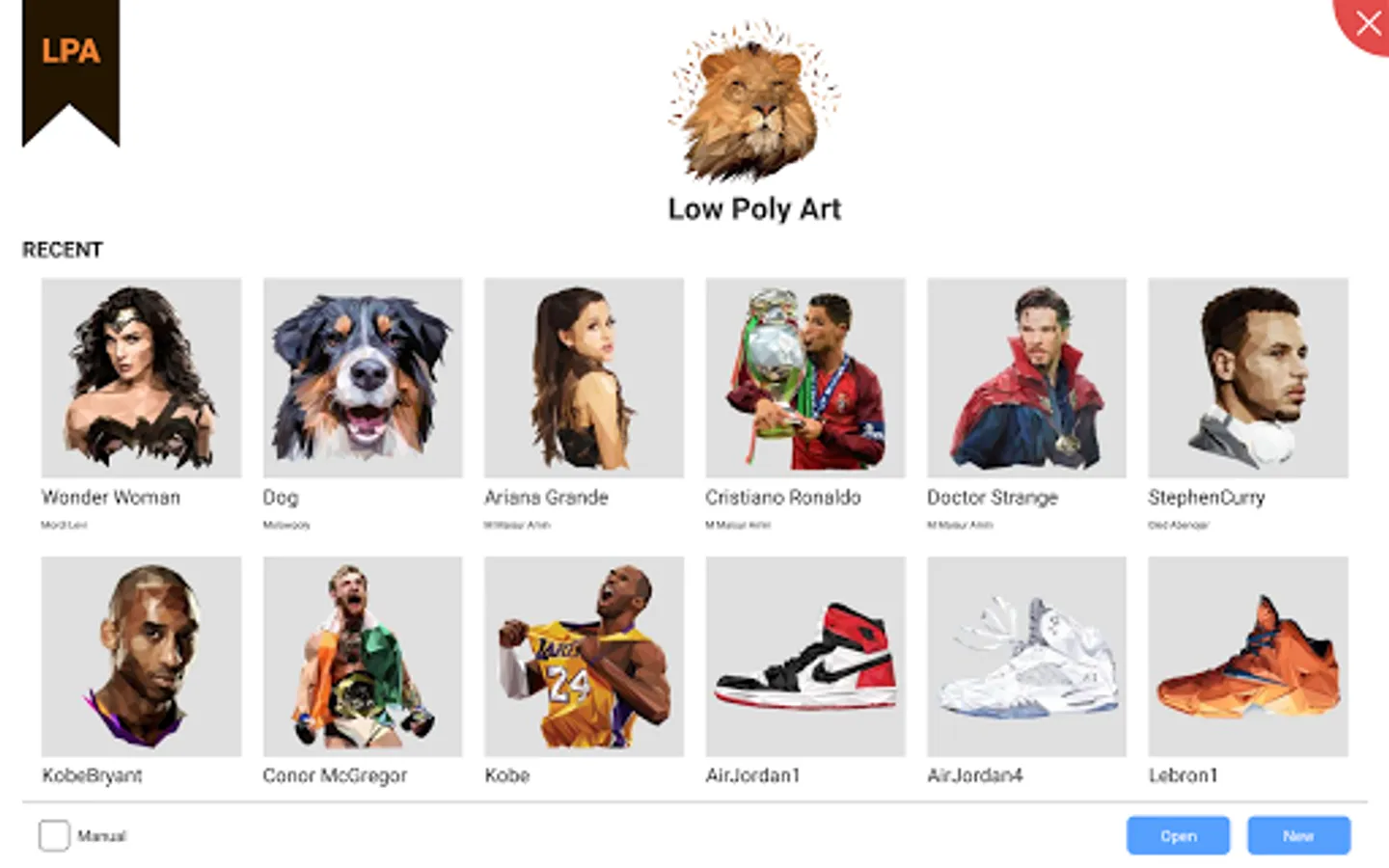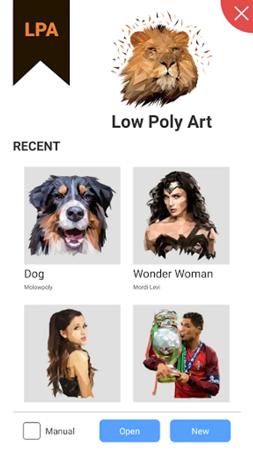 Create art using polygons(triangles). You can open an image from your phone and use all the available tools to create a low polygon art from it. It is the best android app for creating low poly art with a large set of tools. You can export your work in any of the following formats: LPA, JPEG, PNG, SVG.