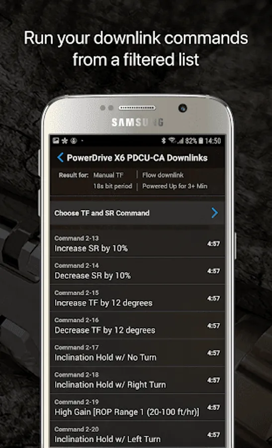 Choose your PowerDrive Orbit, X6 or Archer to view its specific downlink commands. Use the dedicated timer to execute flow or rotary downlinks. Toggle between bit periods and other parameters as the job requires. Finally, export the history of downlinks executed over a period of time to use in your job reports.