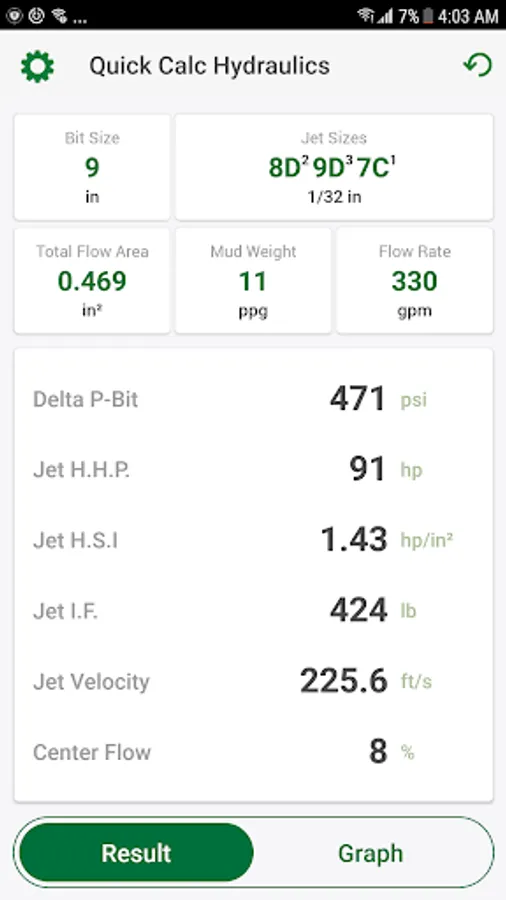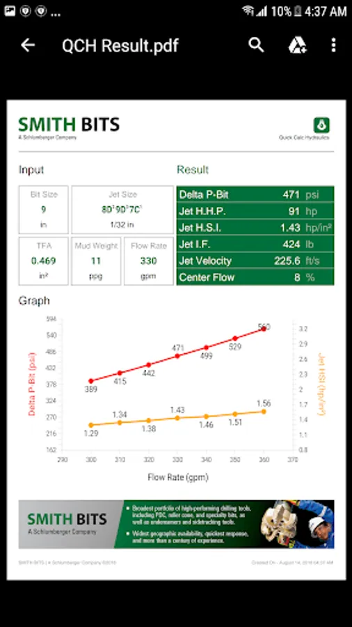 Quick Calc Hydraulics provides a snapshot of the hydraulic horsepower, jet velocity, and impact forces created at a jet nozzle orifice, which is installed in a drilling bit during earth-boring operations. The user provides numbers for fluid density, flow rates, TFA, and bit diameter, and Quick Calc Hydraulics then calculates the respective hydraulic parameters for conventional drilling fluids. Air, mist, and foam fluids are not supported at this time. The calculated results can be forwarded to anyone in the user’s contact list.