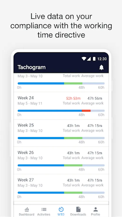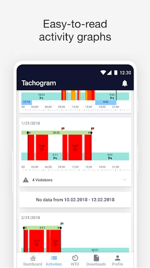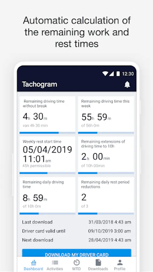TachoLab operates in accordance with all the factors and guidelines of the European Regulations and Agreements. The application accurately records the committed violations, information on working hours and driver stops, and vehicle data, such as the date of the next calibration of the tachograph, all through a simple user interface on mobile devices and computers.