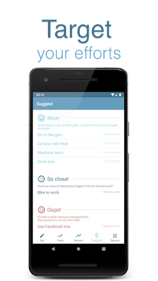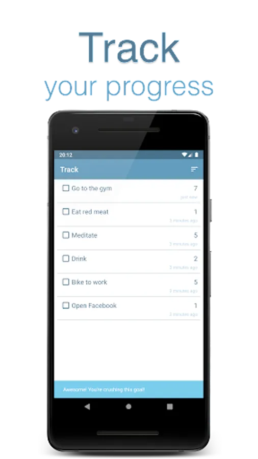 Easily review how you're doing, be encouraged to make that last push each time, and receive praise when you achieve your target.