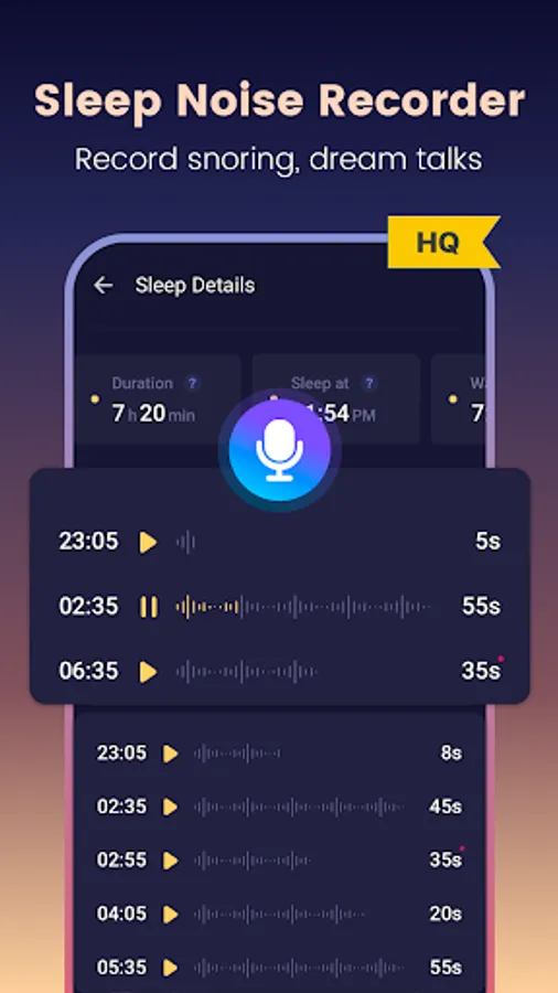 - Sleep Tracker records your sleeping noises such as snoring, dream talking, teeth-grinding, coughing, heavy breathing, etc. You can listen to the recorded sound clips after waking up and see how to improve your sleep quality with those sound insights.