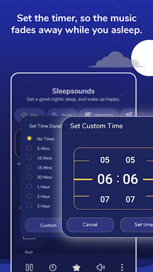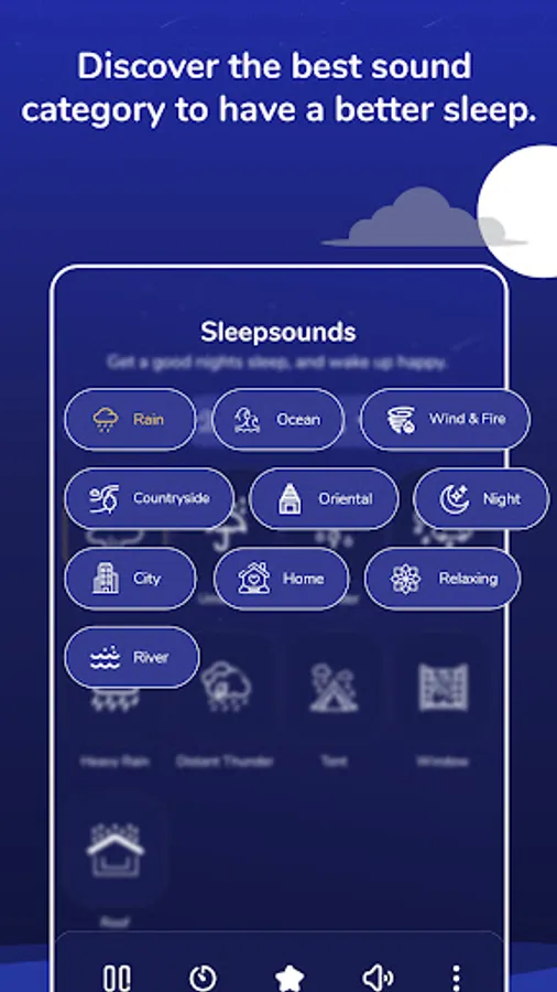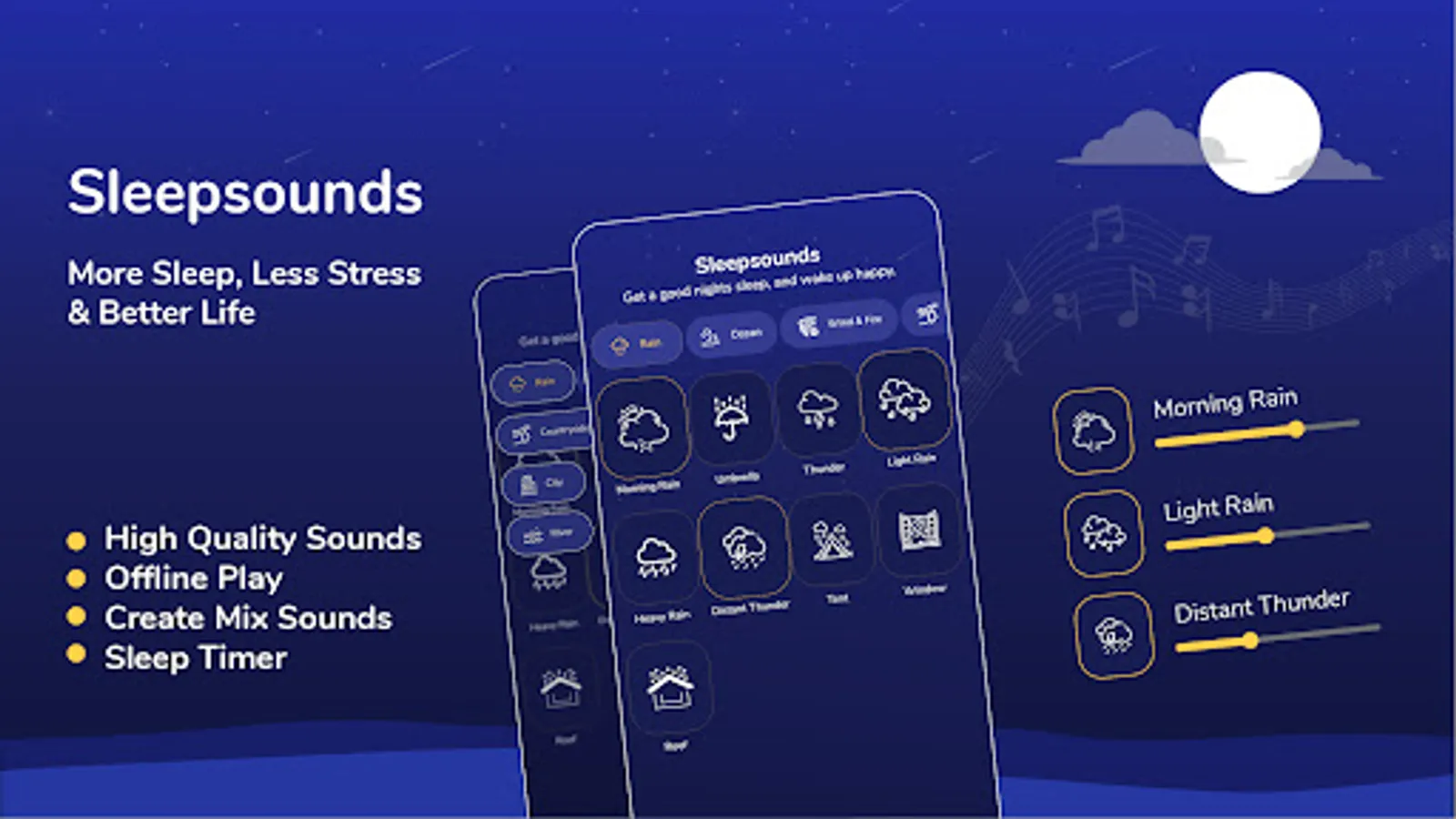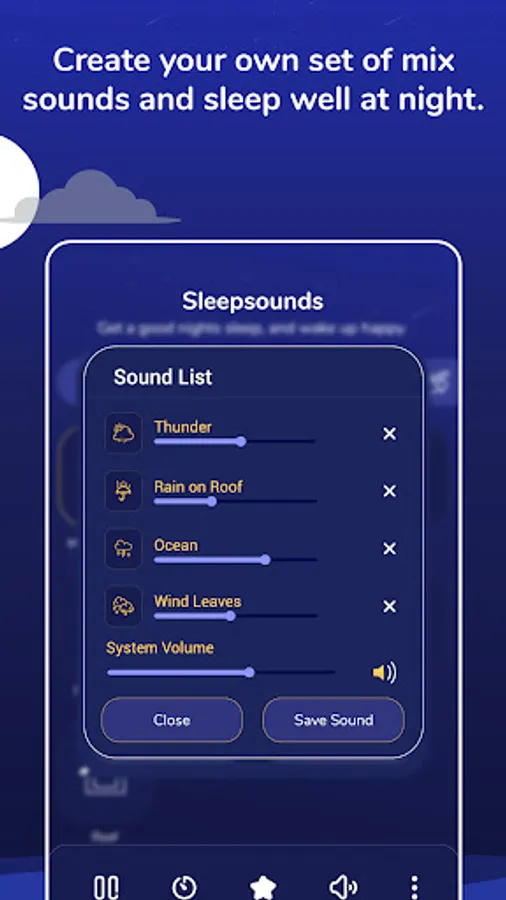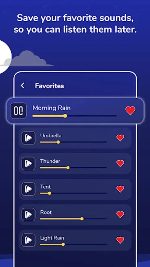 You can select from a variety of sleep sounds like rain sounds, nature sounds, city sounds, white noise, or relax melodies. Save your favorite sleep music mixes to have them with you everywhere.