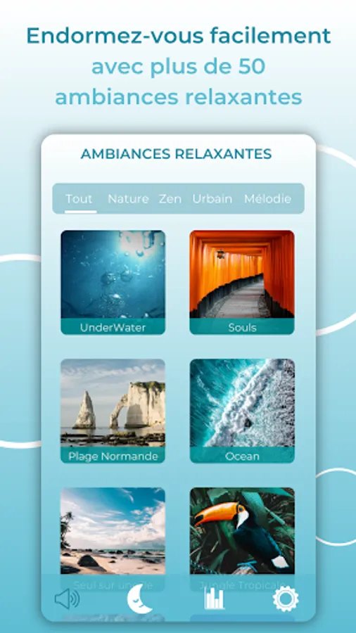 2 - Then choose the sound environment that relaxes you the most and let yourself be rocked! From waves on the beach to the songs of whales to the crackle of a campfire, enjoy more than 50 soundscapes developed in the studio by sleep experts to provide the most suitable environments for sleep and fall asleep in just a few moments.