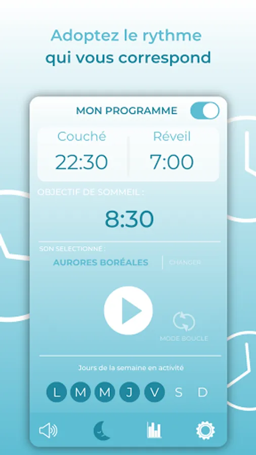 1 - Start by defining your sleep rhythm, choosing times of lying down and waking up as well as days of the week in operation.