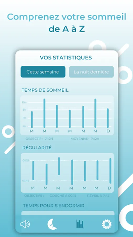 • Your nighttime schedule: Define your sleep goals, wake and sleep times, and active weekdays. Sommnia adapts to your daily life and your habits.