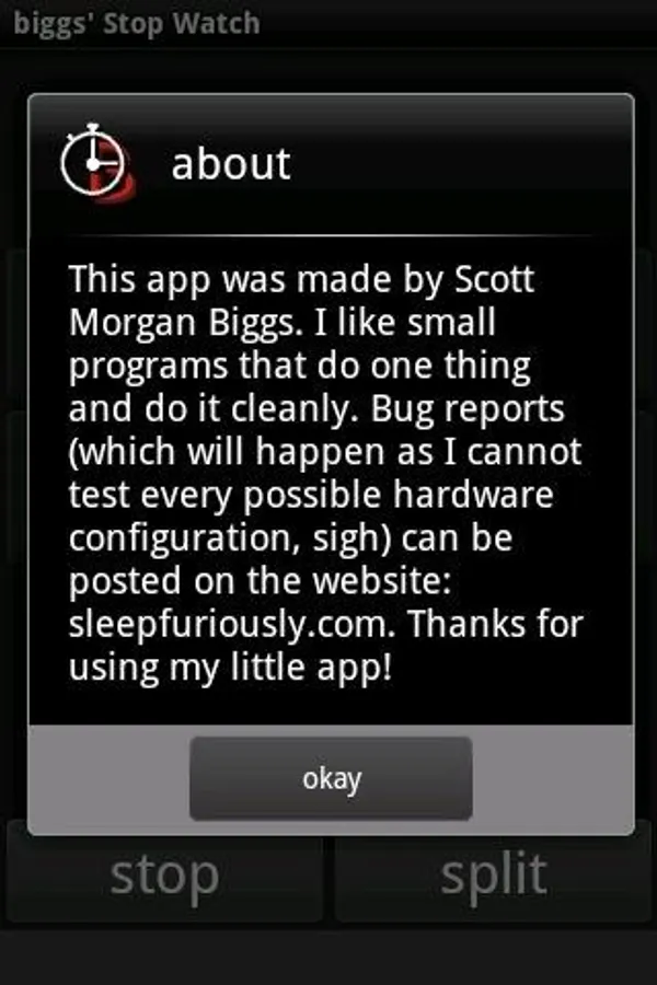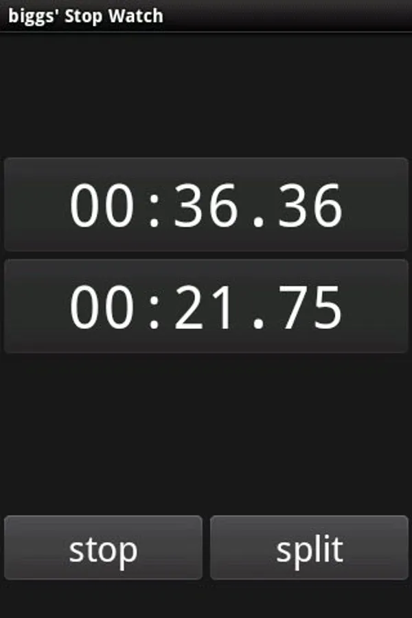 Just a simple easy-to-read stopwatch with an intuitive split timer. Measures up to one-hundredth of a second (which is probably more accurate than your finger).