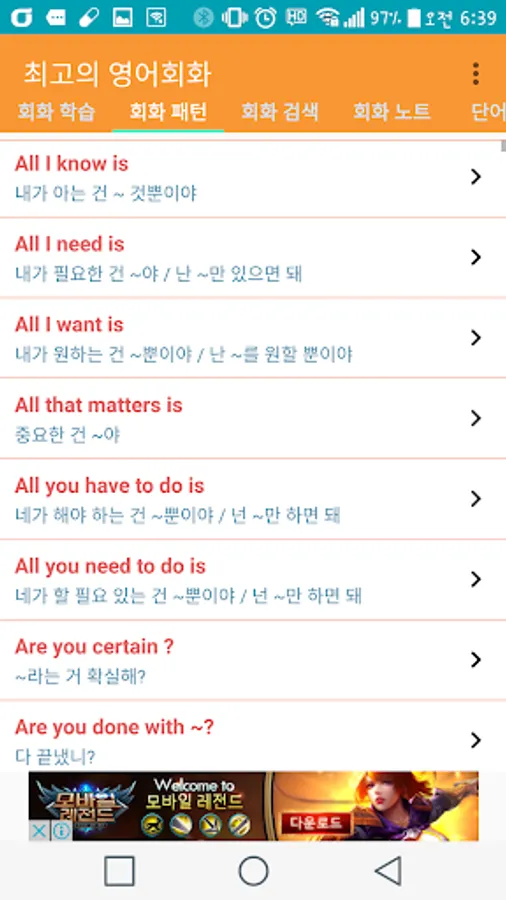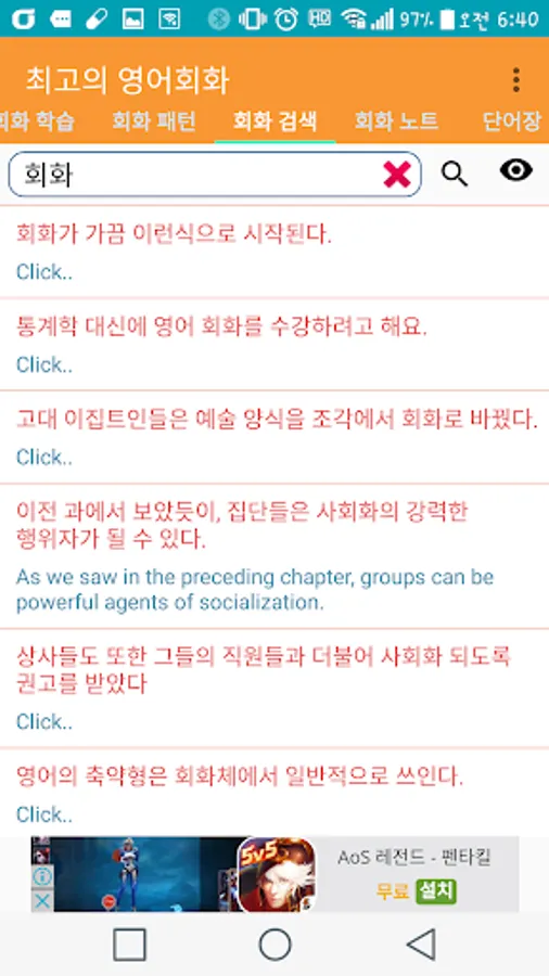 - 회화 패턴 : 600개 정도의 회화 패턴으로 영어회화를 검색 합니다.