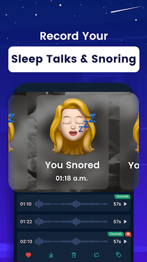Sleep Monitor will record snoring and grinding sounds made during your sleep, listen to them, and find more about your sleep the next morning! For fun!
