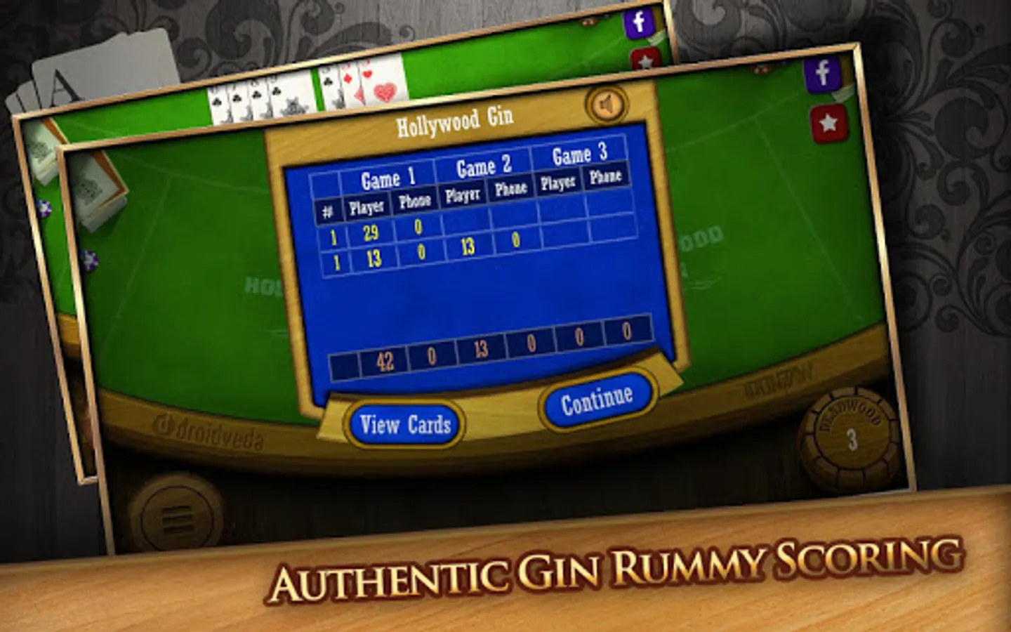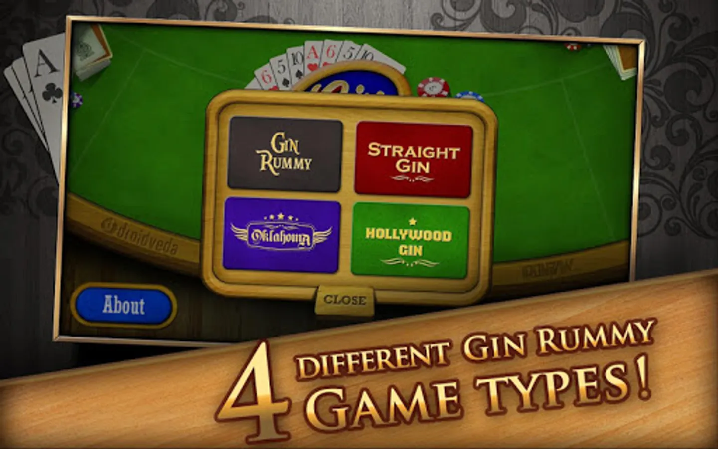 New and experienced players can all enjoy this game by utilizing the three different game type - Straight Gin, Oklahoma Gin, Hollywood Gin.