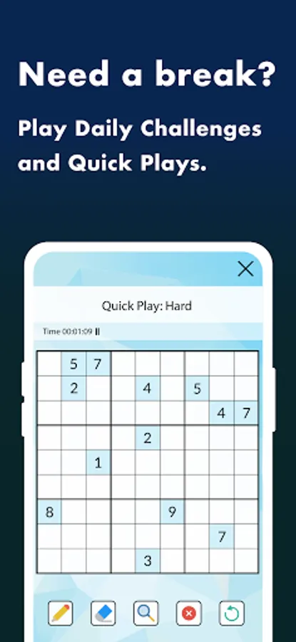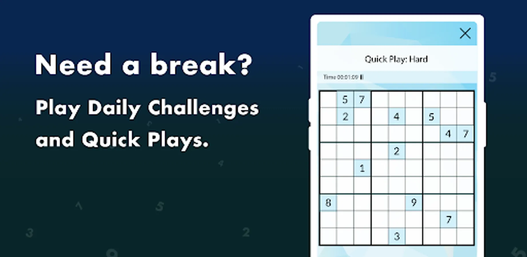 - Quick Play: Take a break and play traditional Sudoku in three different levels.