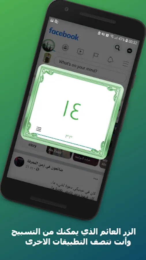 يحتوي على زر عائم مثل الماسنجر ، من خلال الضغط علية يفتح مربع التسبيح ، والذي يمكنك من التسبيح وانت تتصفح اي شيء وانت خارج تطبيق اذكاري. 🤲