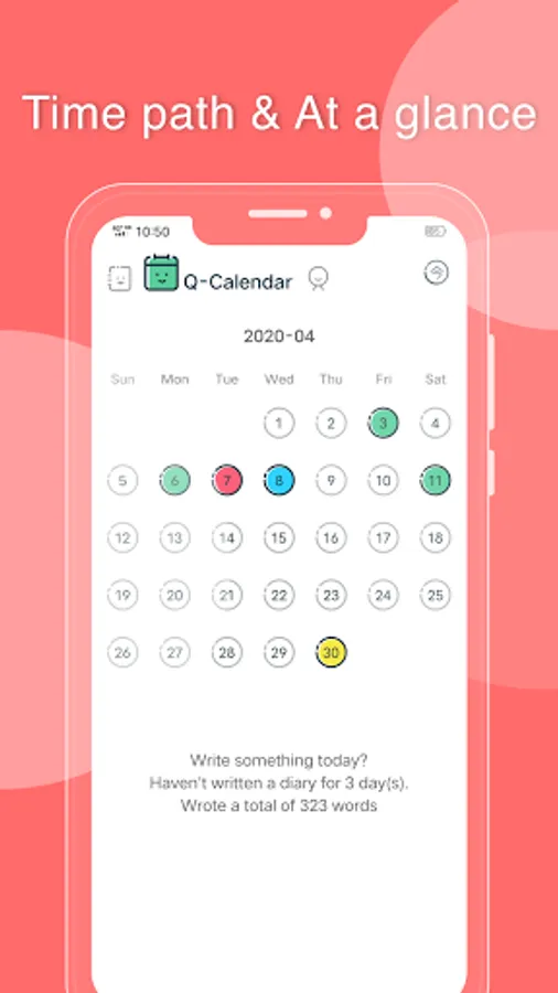 * The calendar page shows the color of the mood every day, at a glance
