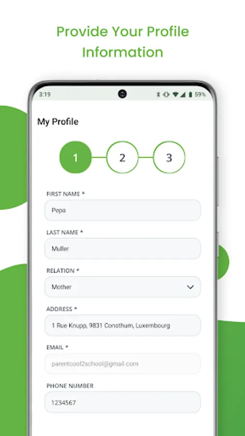 - walk through on-boarding wizard and provide their profile information as well as details of other family members and children