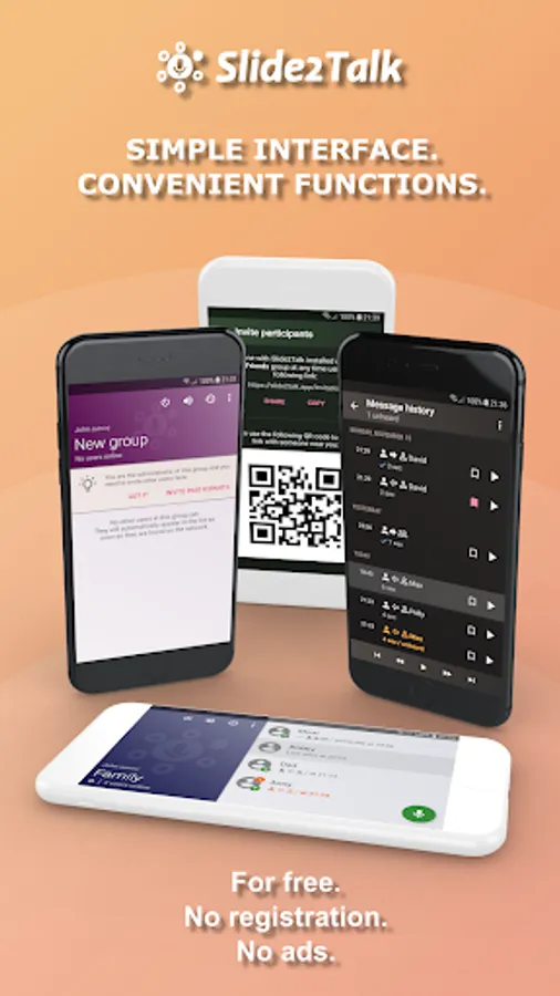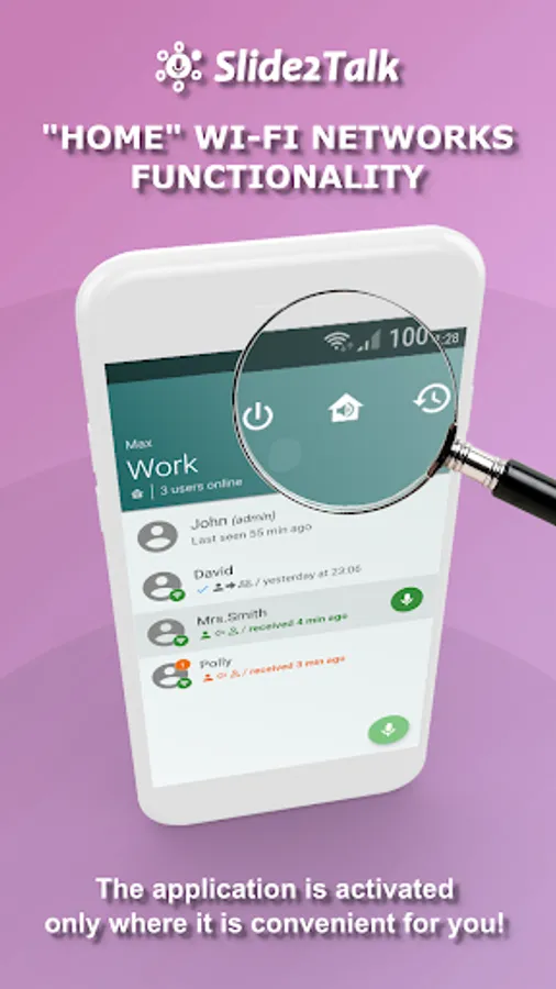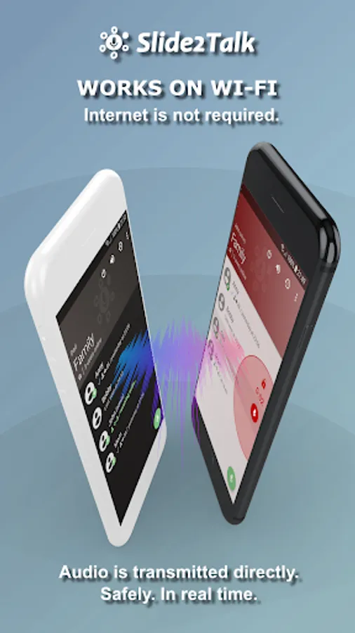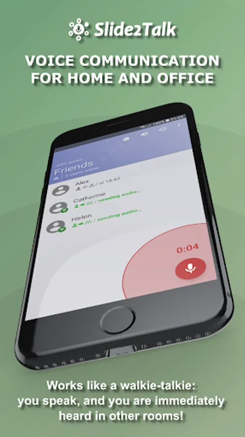 The Slide2Talk (Slide To Talk) is a WiFi intercom, WiFi walkie-talkie for home and office. The application allows you to instantly exchange voice messages in local / WiFi networks (even offline without the Internet). The Slide2Talk works as a two-way radios (walkie-talkie) or intercom with PTT (Push To Talk) function. Incoming audio messages are automatically played through the speaker or headset.