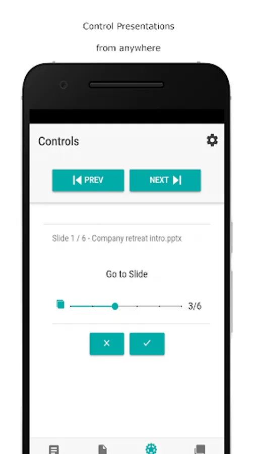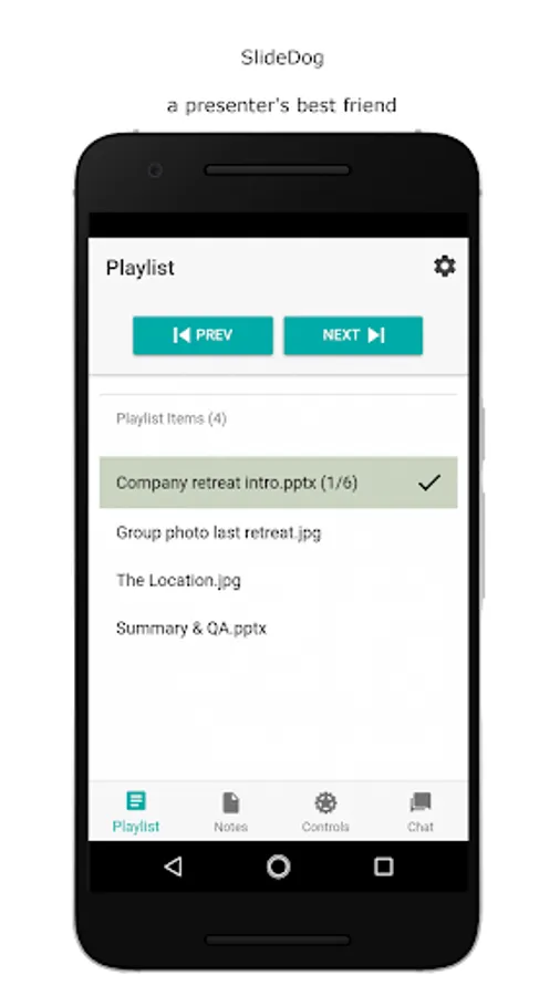 You can start your SlideDog presentation playlist, advance the slides, play and pause videos, see your speaker notes and seamlessly navigate between files — all from your phone.