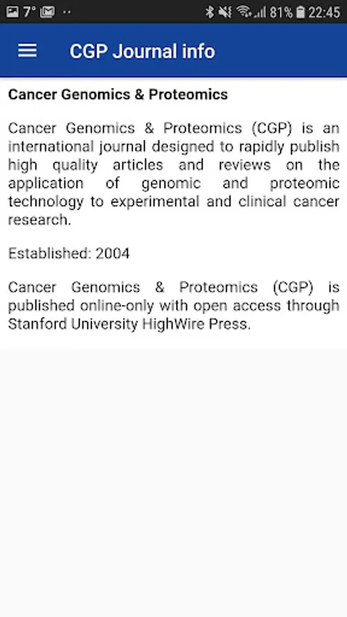 Cancer Genomics & Proteomics appears bimonthly as an online-only open access journal through the Stanford University HighWire Press. Each annual volume contains six issues and index.
