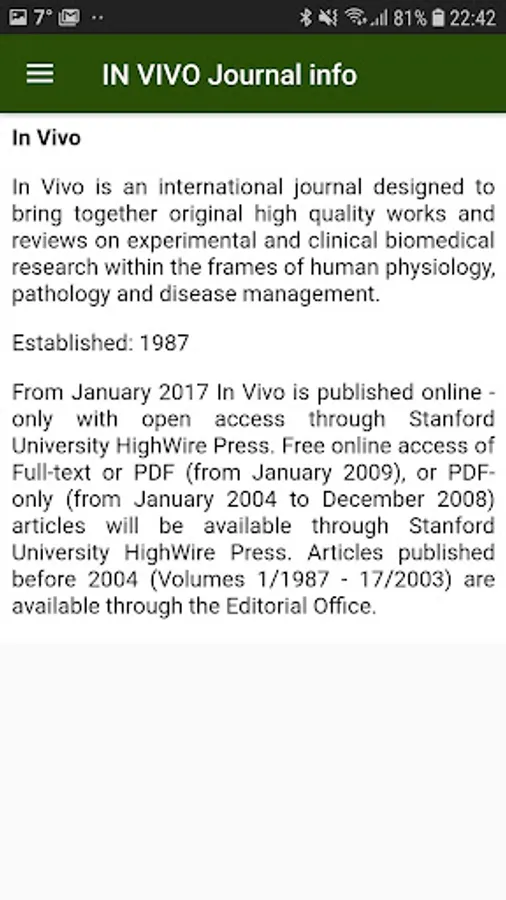 IN VIVO appears online since January 2009 with the Stanford University HighWire Press.