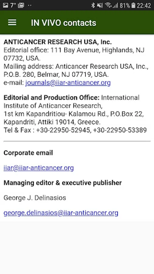 IN VIVO supports (a) the aims and research projects of the INTERNATIONAL INSTITUTE OF ANTICANCER RESEARCH and (b) the organization of the INTERNATIONAL CONFERENCES OF ANTICANCER RESEARCH.